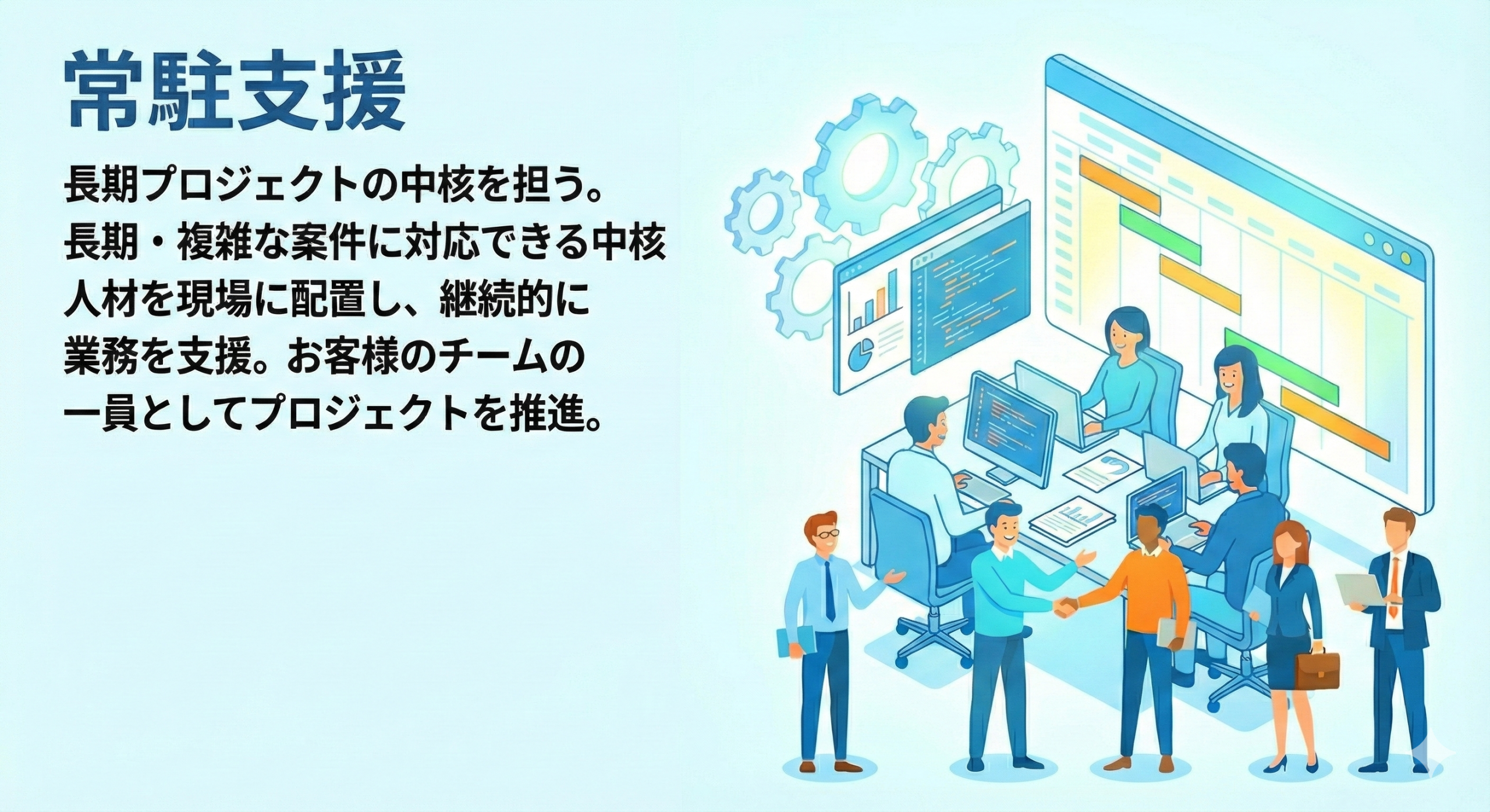 長期・複雑な案件に対応できる中核人材を現場に配置し、継続的に業務を支援します。