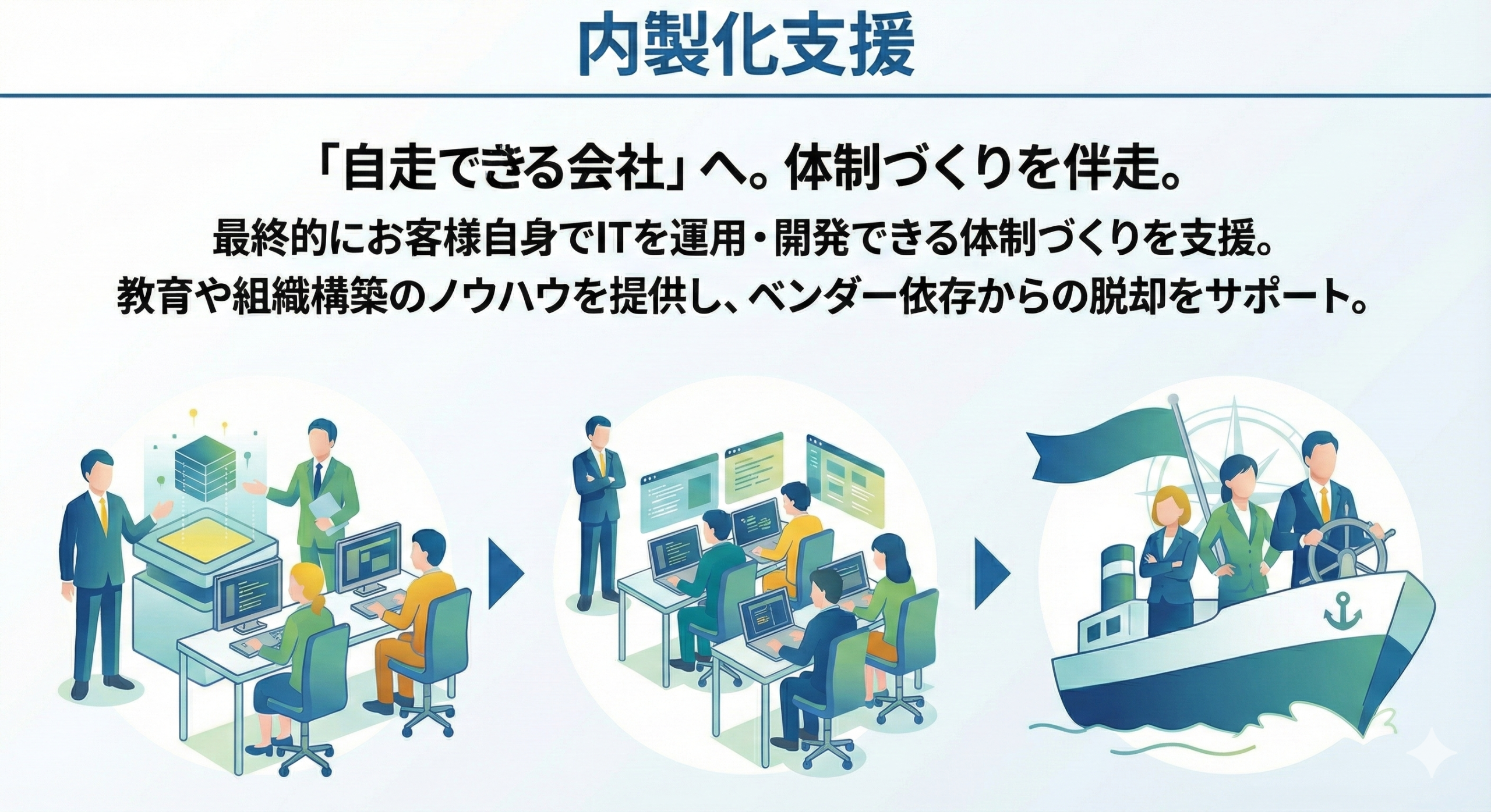 最終的にお客様自身でITを運用・開発できる体制づくりを支援します。